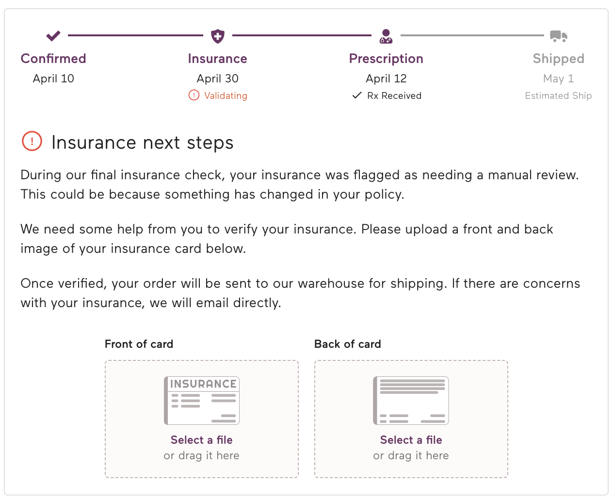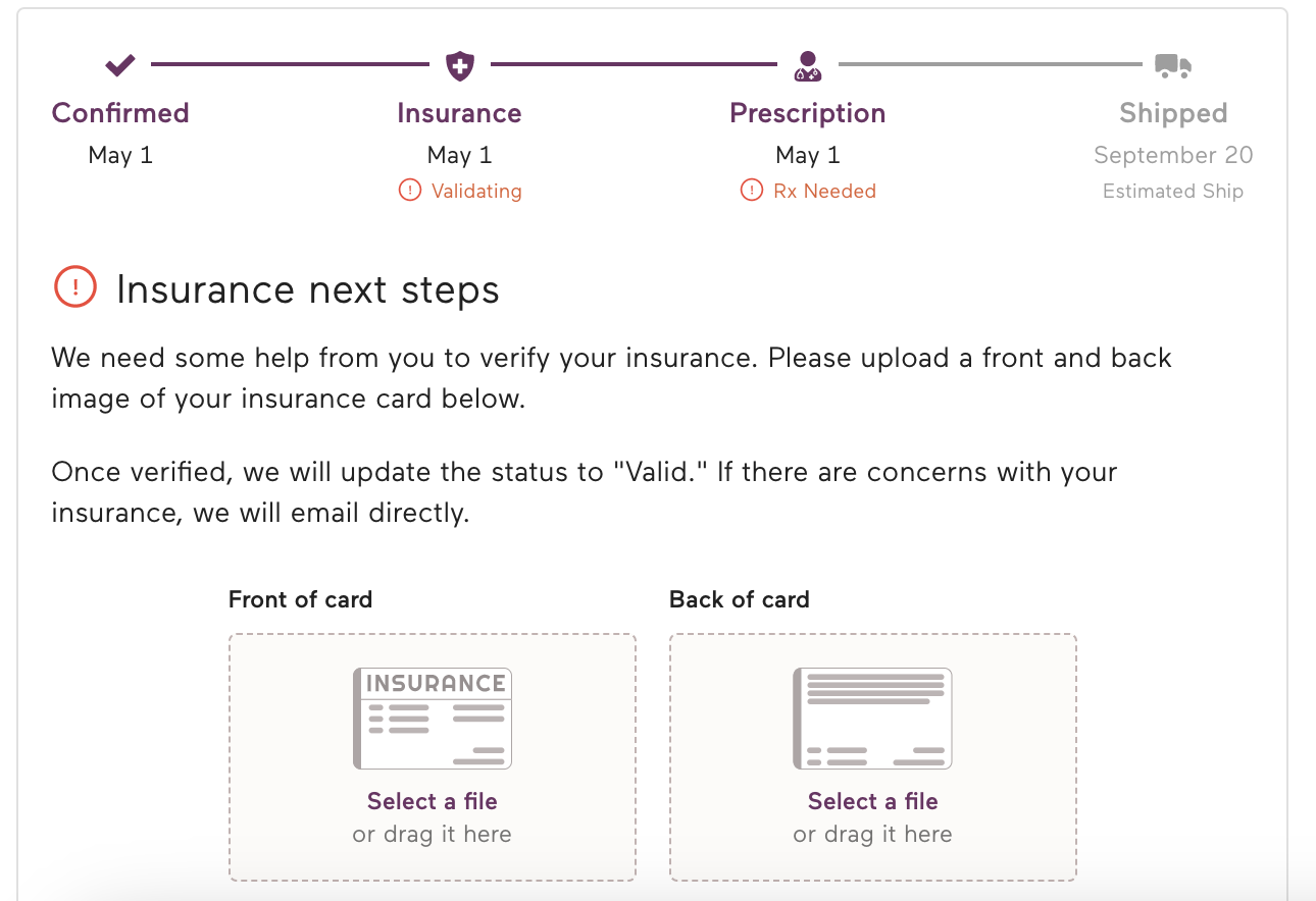 We run an immediate check of your insurance at checkout. Some plans pass this check but are marked as needing manual review. This may mean your plan has unique requirements around breast pumps or a more narrow list of eligible breast suppliers you can work with. Any plans flagged for review are looked at as soon as possible. You can see this process on your order status page. If your does need a manual review, you will see options to upload your member ID card. Doing so can help speed up our review process.