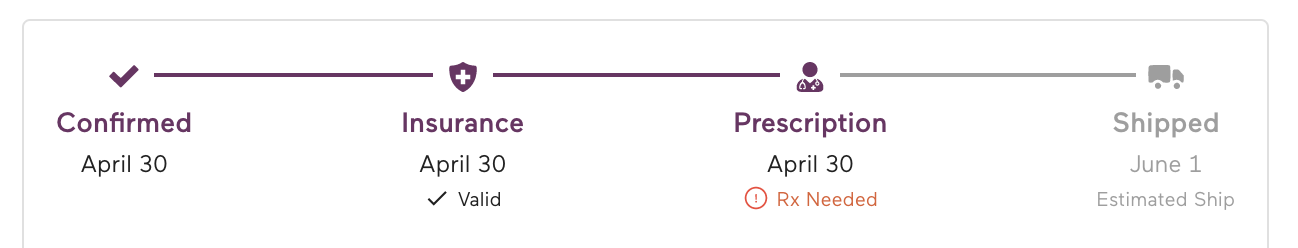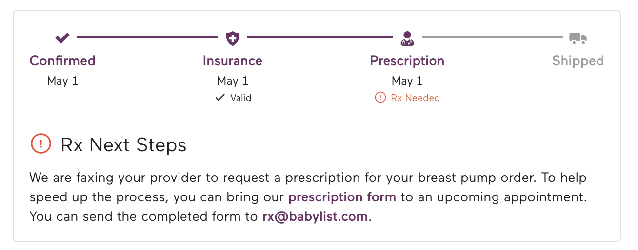 Because Babylist Health orders are through insurance, the process of getting your breast pump looks different than a retail purchase. Before we can ship your pump, we have to make sure we have all the correct paperwork and information to ensure insurance will approve your claim. Typically this looks like getting a valid prescription and verifying we send your pump during your plan's approved shipping window. Below is a breakout of the basic steps we take to complete your order once it is placed and how you can track them using your order status page.